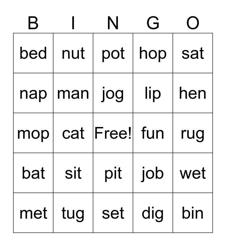 This bingo card has a free space and 24 words: sit, tug, jog, met, sat, bed, nap, nut, fun, pit, lip, mop, job, wet, man, dig, rug, pot, hen, cat, bin, bat, hop and set.