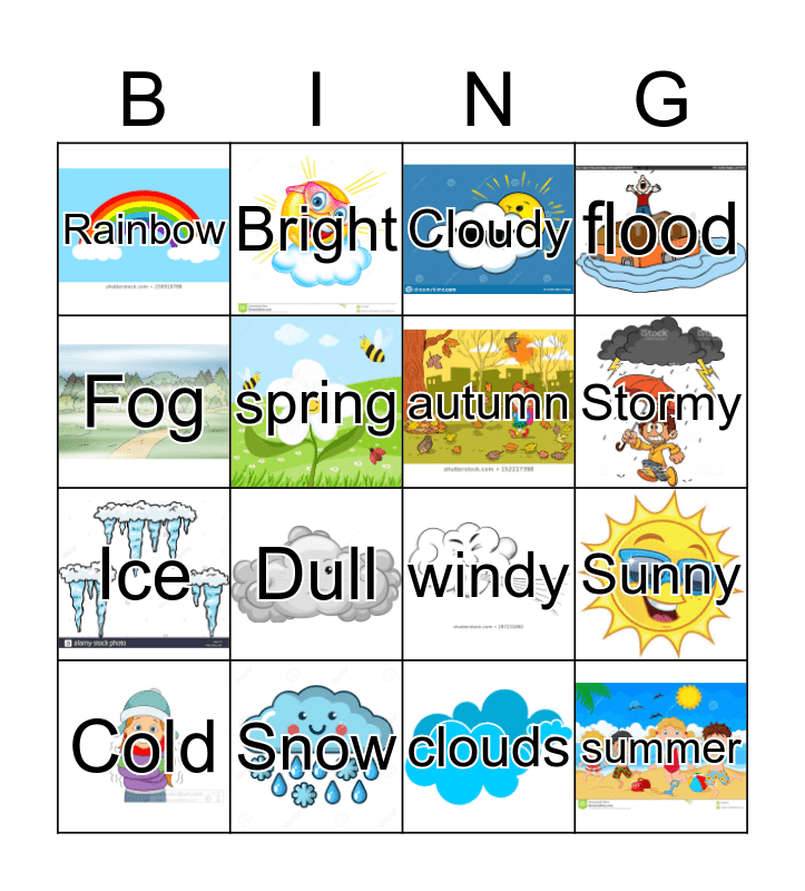 This bingo card has 20 images and 20 words: Sunny, Rain, Cloudy, Hot, Cold, Fog, Snow, Rainbow, Ice, Bright, Dull, windy, spring, summer, autumn, winter, Stormy, flood, clouds and snow.