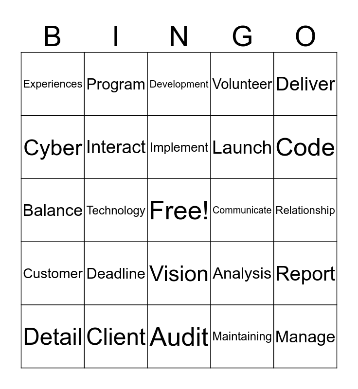 This bingo card has a free space and 50 words: Engage, Manage, Organize, Audit, Deadline, Scientific, Program, Trust, Cyber, Systems, Interact, Volunteer, Report, Analysis, Rules, Identify, Implement, Communicate, Evaluate, Deliver, Technology, Maintaining, Experiences, Launch, Quality, Testing, Code, Project, Development, Vision, Meeting, Design, Brainstorm, Deploy, Client, Demos, Strategy, Facilitate, Presentation, Relationship, Foster, Establish, Effective, Team Work, Detail, Balance, Training, Impact, Customer and Innovative.