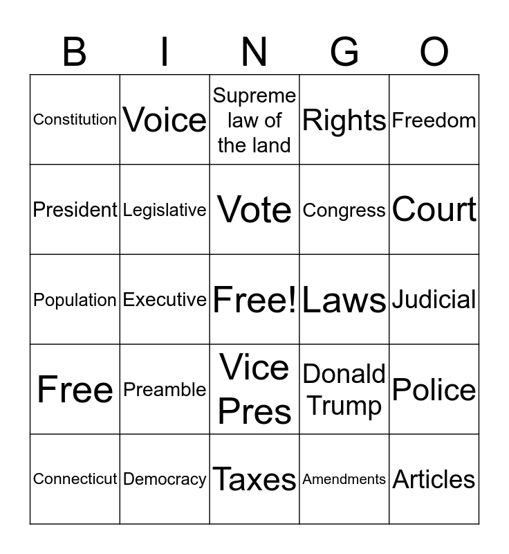 This bingo card has a free space and 24 words: Preamble, Democracy, Vote, Connecticut, Freedom, Constitution, President, Voice, Laws, Vice Pres, Congress, Population, Donald Trump, Police, Legislative, Amendments, Judicial, Supreme law of the land, Court, Executive, Articles, Free, Rights and Taxes.
