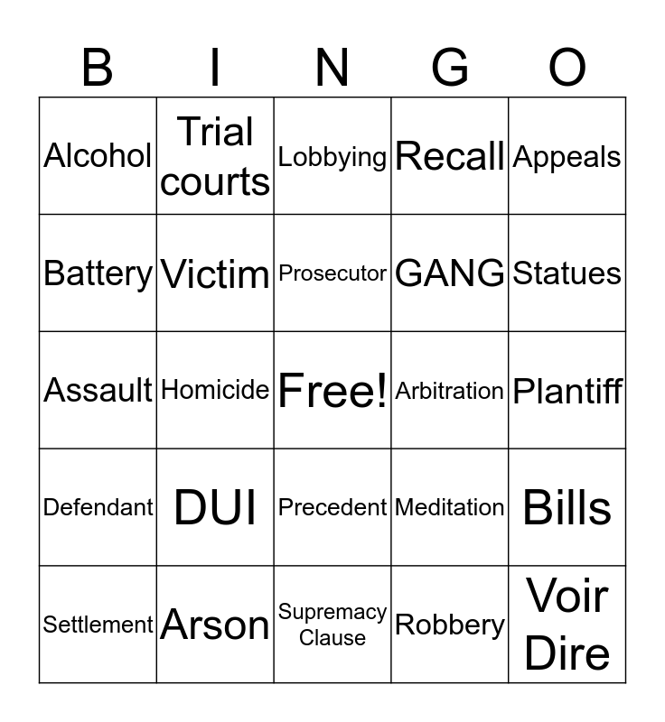 This bingo card has a free space and 24 words: DUI, Arson, Prosecutor, Settlement, Appeals, Alcohol, Battery, Trial courts, Arbitration, Precedent, GANG, Assault, Meditation, Bills, Victim, Robbery, Plantiff, Lobbying, Statues, Homicide, Voir Dire, Defendant, Recall and Supremacy Clause.