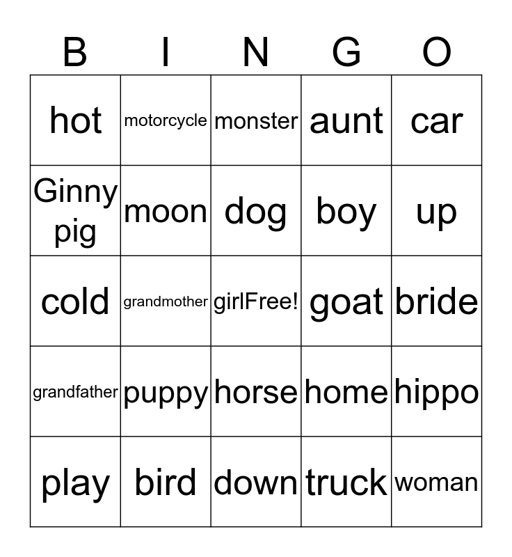 This bingo card has 40 words: cat, cold, rain, moon, bird, horse, dog, uncle, car, grandfather, grandmother, aunt, girlFree!, bride, goat, puppy, sun, hot, clown, monster, hippo, truck, boy, Ginny pig, child, hamster, clouds, rig, woman, man, work, play, games, home, up, down, ride, bike, motorcycle and star.