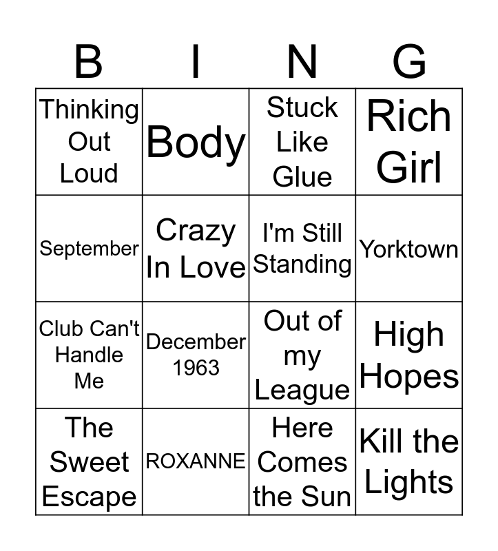 This bingo card has 22 words: ROXANNE, Memories, Body, Sorry, Crazy In Love, I'm Still Standing, Thinking Out Loud, Stuck Like Glue, Out of my League, Kill the Lights, Club Can't Handle Me, Rich Girl, Viva La Vida, Used to Be, Here Comes the Sun, Rock with You, High Hopes, The Sweet Escape, December 1963, September, Yorktown and Saturday Nights.