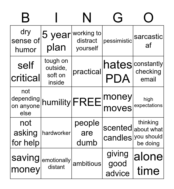 This bingo card has a free space and 24 words: hardworker, emotionally distant, practical, saving money, sarcastic af, dry sense of humor, self critical, 5 year plan, money moves, people are dumb, hates PDA, not depending on anyone else, scented candles, thinking about what you should be doing, tough on outside, soft on inside, giving good advice, high expectations, working to distract yourself, constantly checking email, humility, alone time, not asking for help, pessimistic and ambitious.