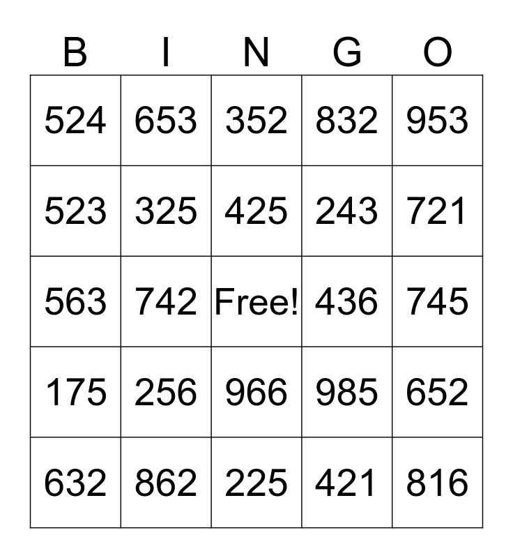 This bingo card has a free space and 27 words: 985, 452, 243, 225, 523, 352, 653, 175, 436, 652, 563, 832, 632, 862, 721, 652, 325, 425, 256, 524, 745, 421, 742, 816, 966, 953 and 325.