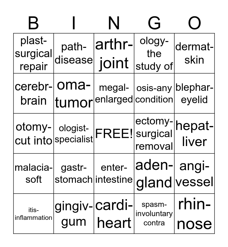 This bingo card has a free space and 25 words: gastr-stomach, cardi-heart, megal-enlarged, itis-inflammation, dermat-skin, plast-surgical repair, cerebr-brain, path-disease, ectomy-surgical removal, enter-intestine, osis-any condition, otomy-cut into, aden-gland, angi-vessel, oma-tumor, nephr-kidney, hepat-liver, arthr-joint, blephar-eyelid, ologist-specialist, rhin-nose, gingiv-gum, malacia-soft, ology-the study of and spasm-involuntary contra.