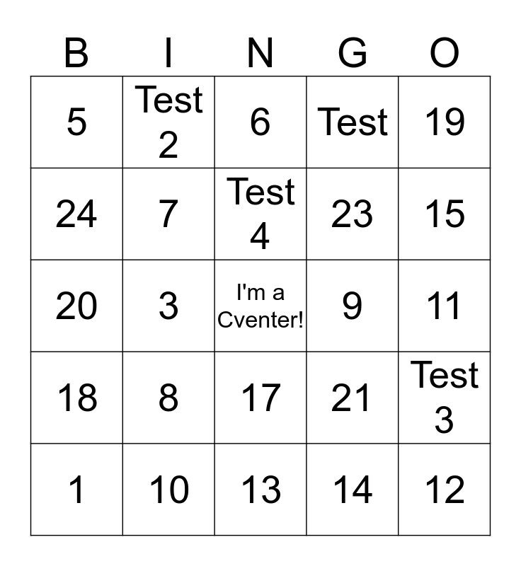 This bingo card has a free space and 29 words: 1, 2, 3, 4, 5, 6, 7, 8, 9, 10, 11, 12, 13, 14, 15, 16, 17, 18, 19, 20, 21, 22, 23, 24, Test, Test 2, Test 3, Test 4 and Test 5.