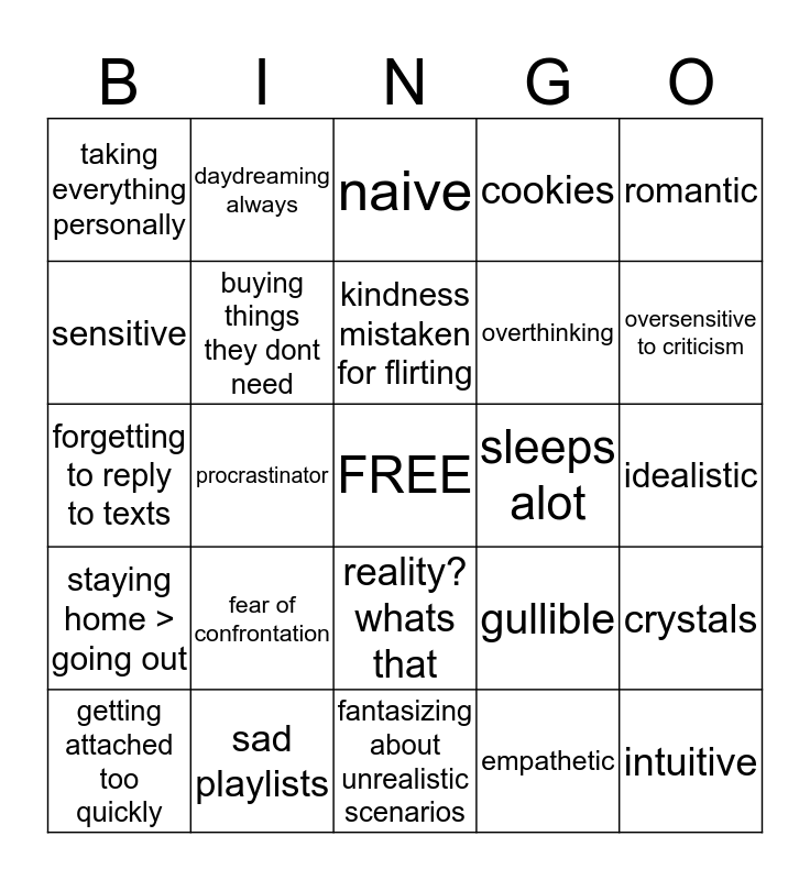 This bingo card has a free space and 24 words: fear of confrontation, sad playlists, kindness mistaken for flirting, getting attached too quickly, romantic, taking everything personally, sensitive, daydreaming always, sleeps alot, reality? whats that, overthinking, forgetting to reply to texts, gullible, crystals, buying things they dont need, empathetic, idealistic, naive, oversensitive to criticism, procrastinator, intuitive, staying home > going out, cookies and fantasizing about unrealistic scenarios.