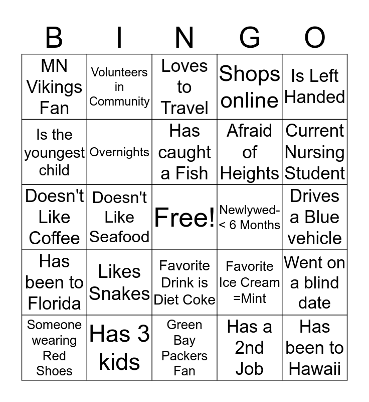 This bingo card has a free space and 24 words: Someone wearing Red Shoes, Likes Snakes, Has caught a Fish, Has a 2nd Job, Is Left Handed, MN Vikings Fan, Volunteers in Community, Loves to Travel, Newlywed-< 6 Months, Drives a Blue vehicle, Doesn't Like Coffee, Overnights, Favorite Ice Cream =Mint, Went on a blind date, Is the youngest child, Has 3 kids, Green Bay Packers Fan, Shops online, Current Nursing Student, Has been to Florida, Doesn't Like Seafood, Favorite Drink is Diet Coke, Afraid of Heights and Has been to Hawaii.