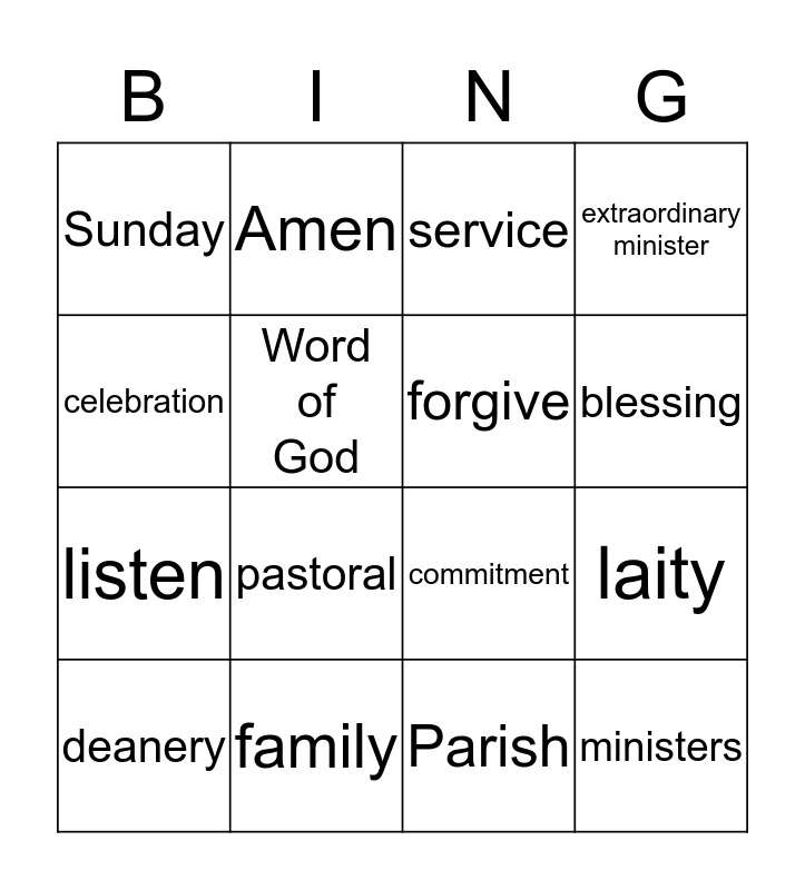 This bingo card has 24 words: community, Parish, blessing, gratitude, celebration, Sunday, Word of God, Amen, family, sacraments, listen, commitment, friends, signs, forgive, responsible, Parish, service, pastoral, laity, deanery, ministers, extraordinary minister and roles.