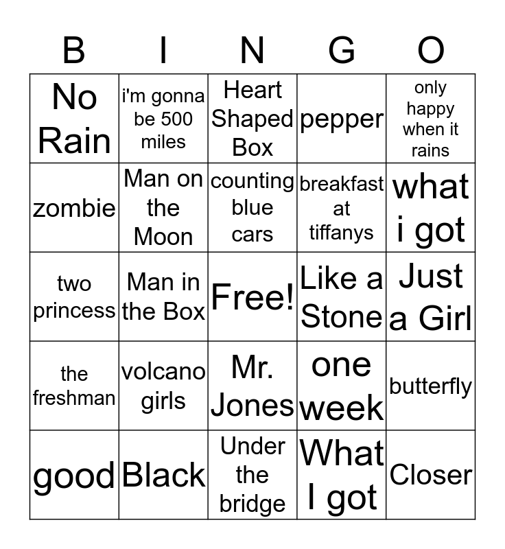 This bingo card has a free space and 30 words: Black, Glycerine, Man in the Box, Black holed sun, No Rain, Heart Shaped Box, Man on the Moon, Mr. Jones, Like a Stone, Under the bridge, Just a Girl, Closer, What I got, tonight tonight, what i got, loser, one week, the freshman, volcano girls, only happy when it rains, two princess, short Skirt long jacket, i'm gonna be 500 miles, breakfast at tiffanys, zombie, pepper, butterfly, good, counting blue cars and hey jealousy.
