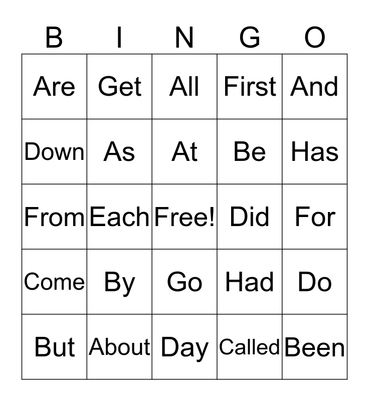 This bingo card has a free space and 30 words: A, About, All, An, And, Are, As, At, Be, Been, But, By, Called, Can, Come, Could, Day, Did, Do, Down, Each, Find, First, For, From, Get, Go, Had, Has and Have.