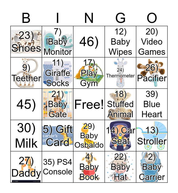 This bingo card has 27 images, a free space and 49 words: 1) Baby Clothes, 2) Baby Carrier, 3) Baby Bottle, 4) Baby Book, 5) Gift Card, 6) Bathtub, 7) Baby Monitor, 8) Changing Pad, 9) Teether, 10) Rattle, 11) Giraffe Socks, 12) Baby Wipes, 13) Stroller, 14) Car Seat, 15) Baby Toys, 16) Diaper Bag, 17) Play Gym, 18) Stuffed Animal, 19) Bibs, 20) Video Games, 21) Baby Gate, 22) Baby Hat, 23) Shoes, 24) Thermometer, 25) Bouncer, 26) Pacifier, 27) Daddy, 28) Mommy, 29) Baby Osbaldo, 30) Milk, 31) Diaper, 32) Baby Hand, 33) Baby Foot, 34) Crib, 35) PS4 Console, 36) Grandpa, 37) Grandma, 38) It’s a Boy, 39) Blue Heart, 40) Baby Powder, 41) Safety Pin, 42) Free Space, 43) Formula, 44) Baby Swing, 45), 46), 47), 48) and 49).