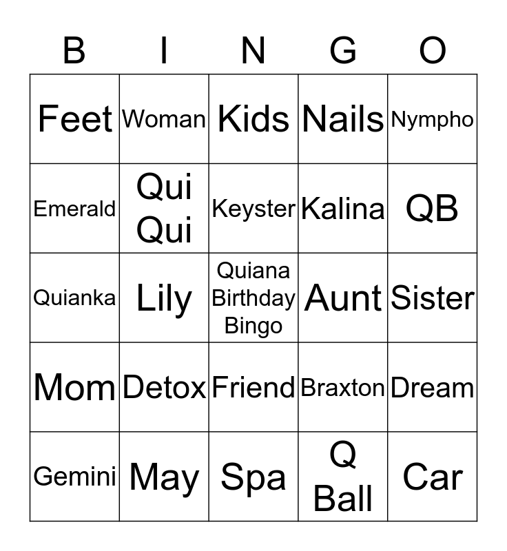 This bingo card has a free space and 24 words: Detox, May, Keyster, Gemini, Nympho, Feet, Emerald, Woman, Aunt, Friend, Kalina, Quianka, Braxton, Dream, Qui Qui, Q Ball, Sister, Kids, QB, Lily, Car, Mom, Nails and Spa.