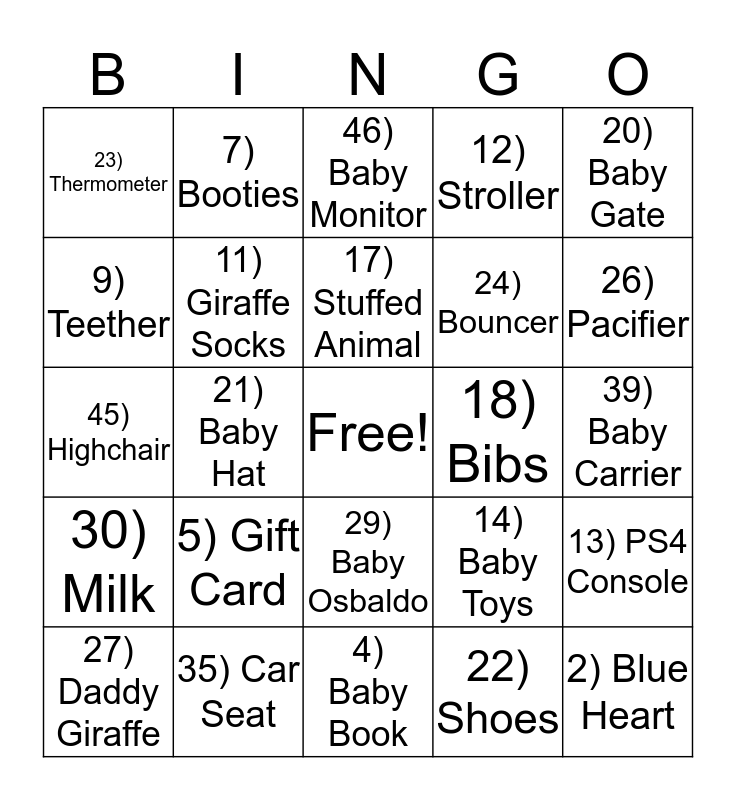 This bingo card has a free space and 49 words: 1) Baby Clothes, 2) Blue Heart, 3) Baby Bottle, 4) Baby Book, 5) Gift Card, 6) Bathtub, 7) Booties, 8) Changing Pad, 9) Teether, 10) Rattle, 11) Giraffe Socks, 12) Stroller, 13) PS4 Console, 14) Baby Toys, 15) Diaper Bag, 16) Play Gym, 17) Stuffed Animal, 18) Bibs, 19) Baby Wipes, 20) Baby Gate, 21) Baby Hat, 22) Shoes, 23) Thermometer, 24) Bouncer, 25) Video Games, 26) Pacifier, 27) Daddy Giraffe, 28) Mommy Giraffe, 29) Baby Osbaldo, 30) Milk, 31) Diaper, 32) Baby Hand, 33) Baby Foot, 34) Crib, 35) Car Seat, 36) Grandpa, 37) Grandma, 38) It’s a Boy, 39) Baby Carrier, 40) Baby Powder, 41) Safety Pin, 42) Free Space, 43) Formula, 44) Baby Swing, 45) Highchair, 46) Baby Monitor, 47) Night Light, 48) Baby Towel and 49) Baby Bingo.