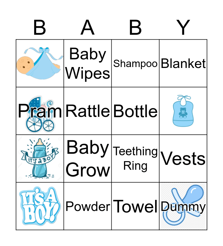 This bingo card has 6 images and 12 words: Powder, Vests, Shampoo, Baby Wipes, Teething Ring, Towel, Pram, Rattle, Blanket, Baby Grow, Bottle and Dummy.