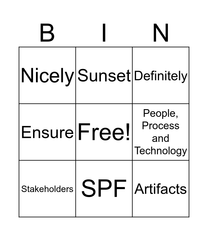 This bingo card has a free space and 10 words: SPF, Definitely, Nicely, Artifacts, Ensure, Stakeholders, Sunset, Actually, People, Process and Technology and Guys.