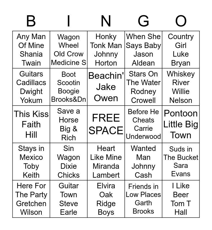 This bingo card has a free space and 24 words: Sin Wagon Dixie Chicks, Guitar Town Steve Earle, Beachin' Jake Owen, Here For The Party Gretchen Wilson, Country Girl Luke Bryan, Any Man Of Mine Shania Twain, Guitars Cadillacs Dwight Yokum, Wagon Wheel Old Crow Medicine S, Before He Cheats Carrie Underwood, Heart Like Mine Miranda Lambert, Stars On The Water Rodney Crowell, This Kiss Faith Hill, Wanted Man Johnny Cash, Suds in The Bucket Sara Evans, Boot Scootin Boogie Brooks&Dn, Friends in Low Places Garth Brooks, Pontoon Little Big Town, Honky Tonk Man Johnny Horton, Whiskey River Willie Nelson, Save a Horse Big & Rich, I Like Beer Tom T Hall, Stays in Mexico Toby Keith, When She Says Baby Jason Aldean and Elvira Oak Ridge Boys.