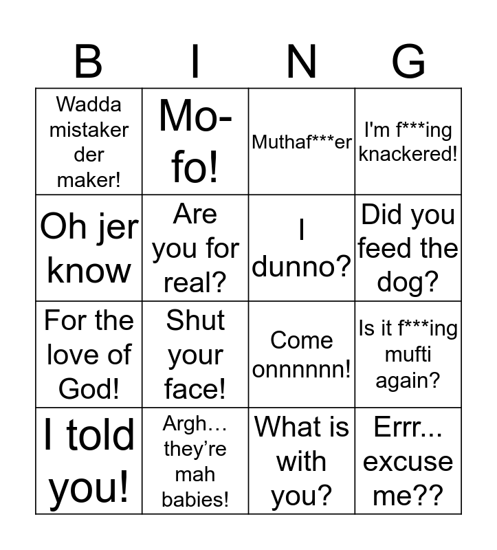 This bingo card has 20 words: Is it f***ing mufti again?, You can’t fall off!, Muthaf***er, D’yer know wadda mean?, I told you!, Oh jer know, Argh… they’re mah babies!, Wadda mistaker der maker!, For the love of God!, Mo-fo!, Shut your face!, Come onnnnnn!, Are you for real?, Errr... excuse me??, I dunno?, Seriously!?!, Did you feed the dog?, I'm f***ing knackered!, What is with you? and You got any dog bags?.