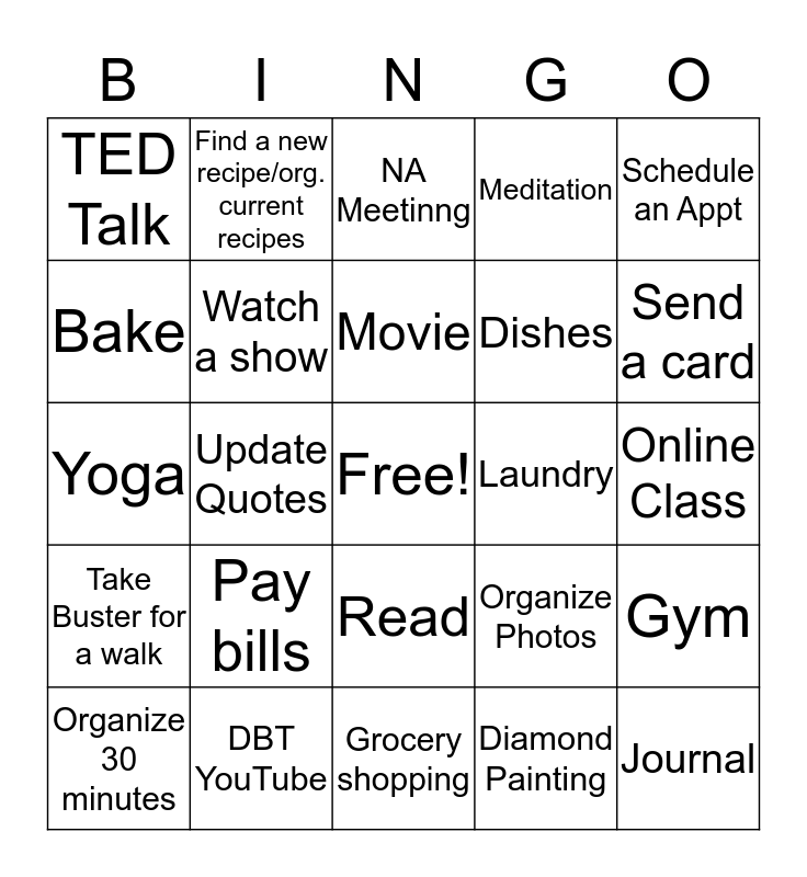 This bingo card has a free space and 28 words: Gym, Shower, Dishes, Diamond Painting, Bake, NA Meetinng, Find a new recipe/org. current recipes, Take Buster for a walk, Laundry, Organize 30 minutes, Yoga, Meditation, DBT YouTube, Grocery shopping, Send a card, Call someone, Pay bills, Watch a show, Movie, Read, TED Talk, Calligraphy, Journal, Update Quotes, Online Class, Organize Photos, Schedule an Appt and Look in to vol. opportunity.