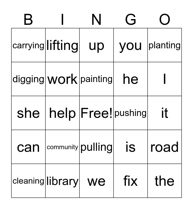 This bingo card has a free space and 24 words: community, library, painting, cleaning, planting, carrying, digging, lifting, pushing, pulling, he, she, is, road, work, fix, it, up, I, help, the, can, you and we.