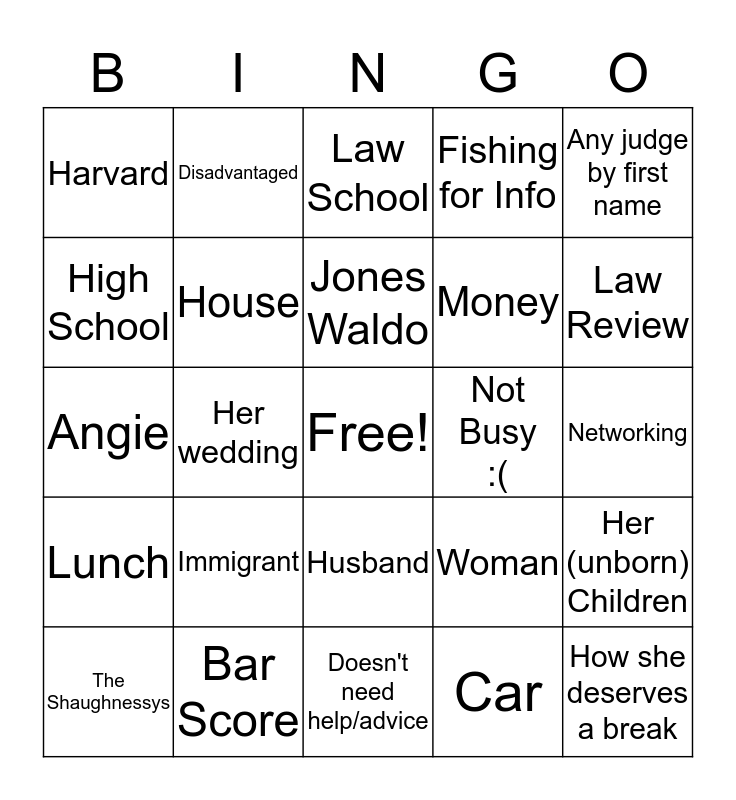 This bingo card has a free space and 24 words: Immigrant, Bar Score, Jones Waldo, The Shaughnessys, Any judge by first name, Harvard, High School, Disadvantaged, Not Busy :(, Husband, Money, Angie, Woman, Her (unborn) Children, House, Car, Networking, Law School, Law Review, Her wedding, How she deserves a break, Lunch, Fishing for Info and Doesn't need help/advice.