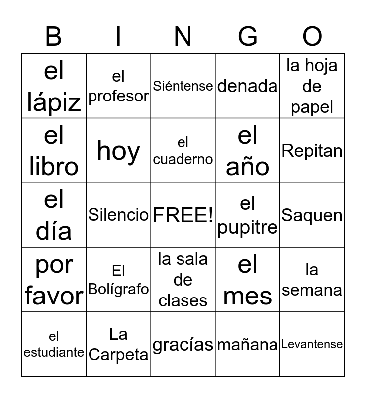 This bingo card has a free space and 24 words: El Bolígrafo, La Carpeta, el cuaderno, el estudiante, la hoja de papel, el lápiz, el libro, el profesor, el pupitre, la sala de clases, el año, el día, el mes, la semana, hoy, mañana, Saquen, Siéntense, Repitan, Silencio, Levantense, por favor, denada and gracías.