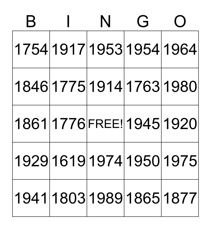 This bingo card has a free space and 24 words: 1619, 1803, 1914, 1941, 1964, 1754, 1846, 1917, 1945, 1974, 1763, 1861, 1950, 1975, 1775, 1865, 1920, 1953, 1980, 1776, 1877, 1929, 1954 and 1989.
