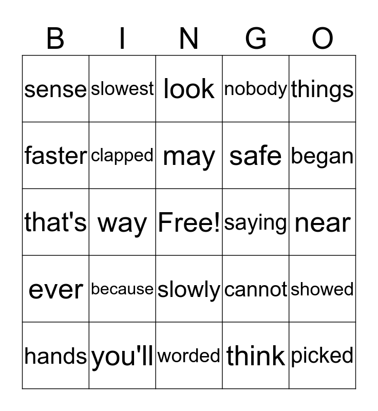 This bingo card has a free space and 29 words: money, you'll, look, good, things, sense, clapped, may, saying, showed, hands, way, think, picked, that's, odd, worded, cannot, began, ever, because, nearly, safe, near, faster, slowest, slowly, nobody and never.