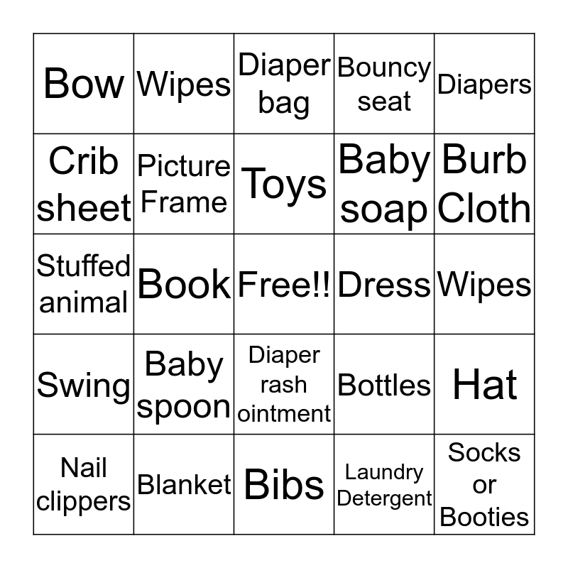 This bingo card has a free space and 29 words: Nail clippers, Monitor, Book, Pacifier, Bow, Diaper bag, Picture Frame, Baby spoon, Dress, Blanket, Wipes, Socks or Booties, Bibs, Laundry Detergent, Burb Cloth, Towel, Diaper rash ointment, Swing, Diapers, Stuffed animal, Bottles, Hairbrush or comb, Baby soap, Crib sheet, Bouncy seat, Wipes, Hat, Toys and Baby lotion.