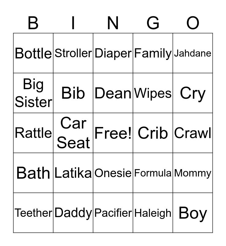 This bingo card has a free space and 24 words: Teether, Latika, Dean, Haleigh, Jahdane, Bottle, Stroller, Diaper, Crib, Crawl, Rattle, Bib, Formula, Mommy, Big Sister, Daddy, Pacifier, Family, Cry, Bath, Car Seat, Onesie, Wipes and Boy.