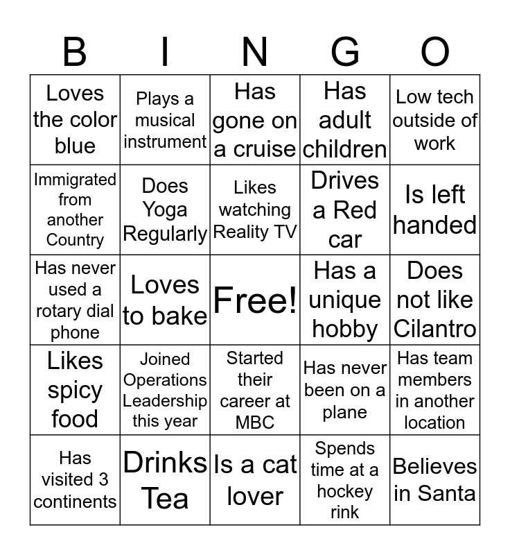 This bingo card has a free space and 24 words: Joined Operations Leadership this year, Drinks Tea, Likes watching Reality TV, Has visited 3 continents, Low tech outside of work, Loves the color blue, Immigrated from another Country, Plays a musical instrument, Has a unique hobby, Started their career at MBC, Drives a Red car, Has never used a rotary dial phone, Has never been on a plane, Has team members in another location, Does Yoga Regularly, Spends time at a hockey rink, Does not like Cilantro, Has gone on a cruise, Is left handed, Loves to bake, Believes in Santa, Likes spicy food, Has adult children and Is a cat lover.