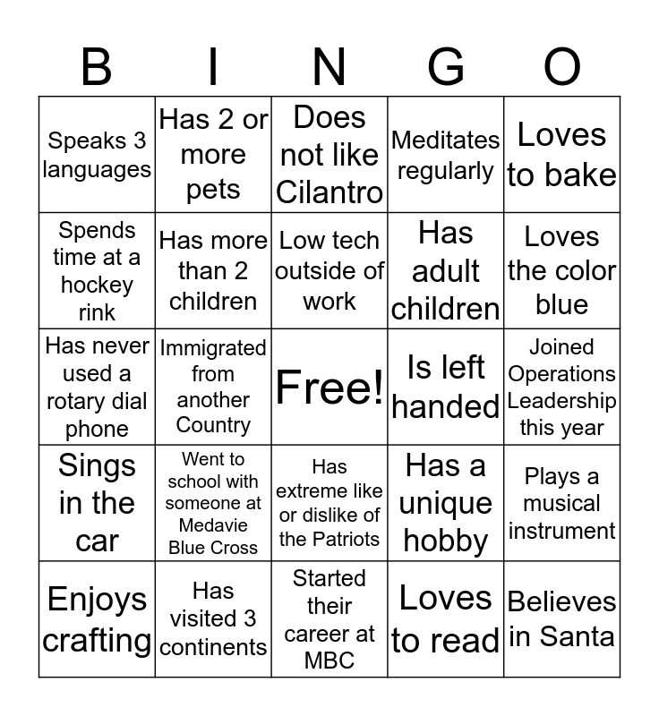 This bingo card has a free space and 24 words: Went to school with someone at Medavie Blue Cross, Has visited 3 continents, Low tech outside of work, Enjoys crafting, Loves to bake, Speaks 3 languages, Spends time at a hockey rink, Has 2 or more pets, Is left handed, Has extreme like or dislike of the Patriots, Has adult children, Has never used a rotary dial phone, Has a unique hobby, Plays a musical instrument, Has more than 2 children, Loves to read, Joined Operations Leadership this year, Does not like Cilantro, Loves the color blue, Immigrated from another Country, Believes in Santa, Sings in the car, Meditates regularly and Started their career at MBC.