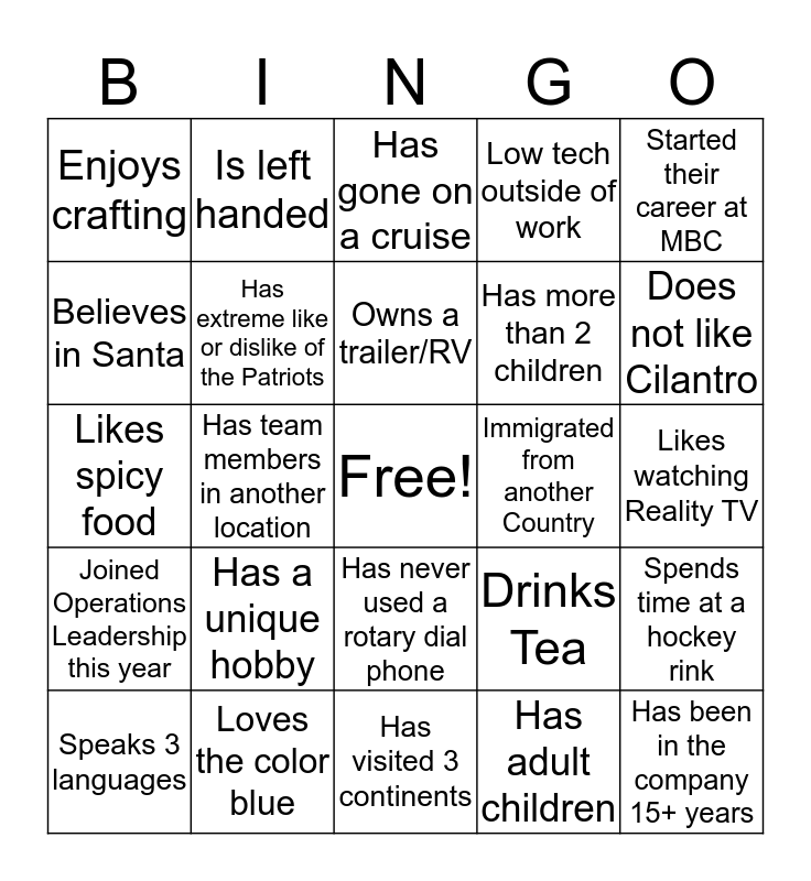 This bingo card has a free space and 24 words: Has a unique hobby, Loves the color blue, Owns a trailer/RV, Speaks 3 languages, Started their career at MBC, Enjoys crafting, Believes in Santa, Is left handed, Immigrated from another Country, Has never used a rotary dial phone, Has more than 2 children, Likes spicy food, Drinks Tea, Spends time at a hockey rink, Has extreme like or dislike of the Patriots, Has adult children, Likes watching Reality TV, Has gone on a cruise, Does not like Cilantro, Has team members in another location, Has been in the company 15+ years, Joined Operations Leadership this year, Low tech outside of work and Has visited 3 continents.