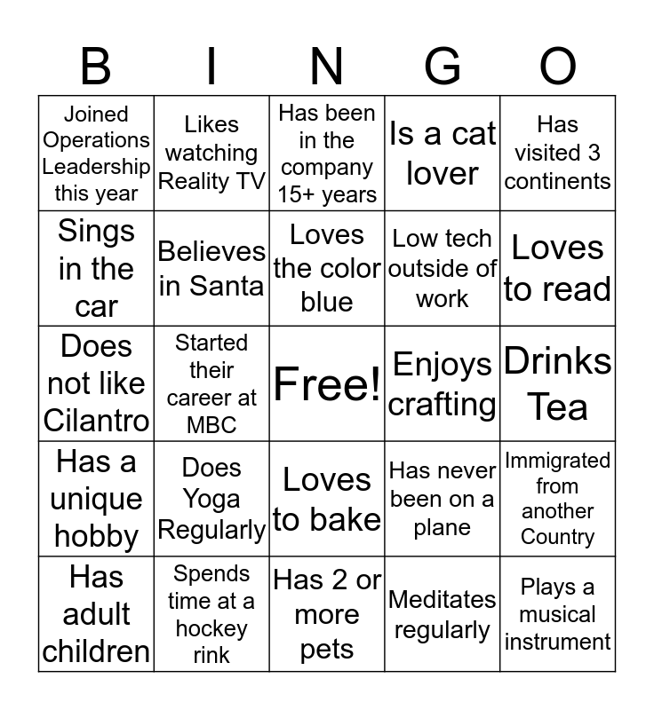 This bingo card has a free space and 24 words: Does Yoga Regularly, Spends time at a hockey rink, Loves the color blue, Has adult children, Has visited 3 continents, Joined Operations Leadership this year, Sings in the car, Likes watching Reality TV, Enjoys crafting, Loves to bake, Low tech outside of work, Does not like Cilantro, Has never been on a plane, Immigrated from another Country, Believes in Santa, Meditates regularly, Drinks Tea, Has been in the company 15+ years, Loves to read, Started their career at MBC, Plays a musical instrument, Has a unique hobby, Is a cat lover and Has 2 or more pets.