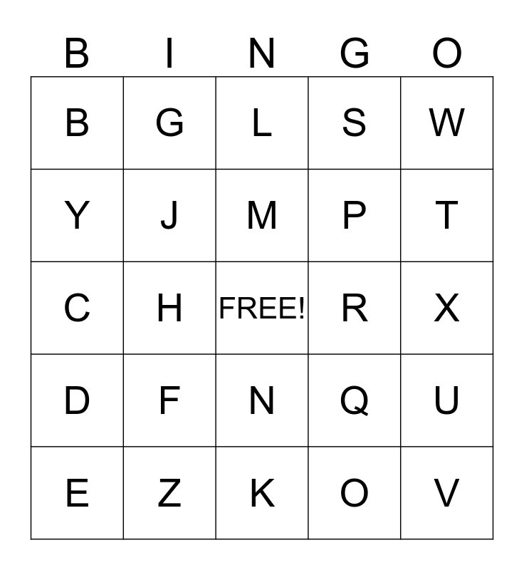 This bingo card has a free space and 26 words: A, F, K, O, T, B, G, L, P, U, C, H, Q, V, D, I, M, R, W, E, J, N, S, X, Y and Z.