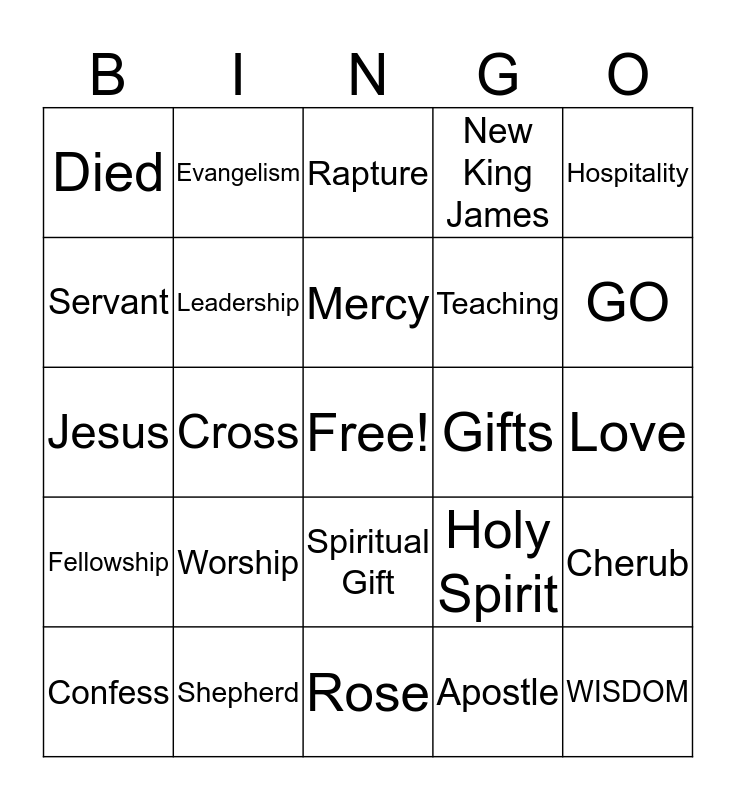This bingo card has a free space and 64 words: Spirit, Alpha, Power, Apostle, BIBLE, Discernment, Evangelism, Faith, Gifts, Giving, Fellowship, Healing, Holy Spirit, Hospitality, Knowledge, Leadership, Mercy, New King James, Prophecy, Servant, Shepherd, Spiritual Gift, Teaching, WISDOM, Evangelism, Bible, Sinner, Salvation, Love, Confess, Believe, Death, Redeem, Admit, Jesus, Christ, FREE, Savior, Study, Died, Cross, Rose, Eternal, Life, Faith, Worship, Sunday, Wages, GO, Admiration, Baptism, Alter, Repent, Cherub, Omnipotent, Rejoice, Rapture, Sacrifice, Tribulation, Sermon, Wrath, Comforter, The Cross and Omega.