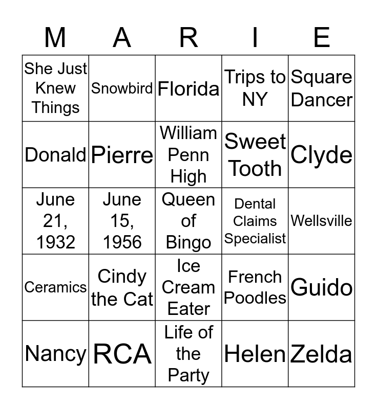 This bingo card has a free space and 24 words: Cindy the Cat, RCA, William Penn High, Nancy, Square Dancer, She Just Knew Things, Donald, Snowbird, Dental Claims Specialist, Ice Cream Eater, Sweet Tooth, June 21, 1932, French Poodles, Guido, Pierre, Helen, Wellsville, Florida, Clyde, June 15, 1956, Zelda, Ceramics, Trips to NY and Life of the Party.