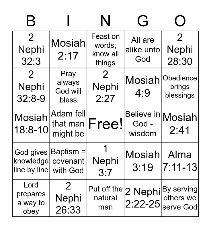 This bingo card has a free space and 26 words: 1 Nephi 3:7, 2 Nephi 2:22-25, 2 Nephi 2:27, 2 Nephi 26:33, 2 Nephi 28:30, 2 Nephi 32:3, 2 Nephi 32:8-9, Mosiah 2:17, Mosiah 2:41, Mosiah 3:19, Mosiah 4:9, Mosiah 18:8-10, Alma 7:11-13, Lord prepares a way to obey, Adam fell that man might be, We are free to choose, All are alike unto God, God gives knowledge line by line, Feast on words, know all things, By serving others we serve God, Obedience brings blessings, Put off the natural man, Believe in God - wisdom, Baptism = covenant with God, Pray always God will bless and Jesus overcame our sins.