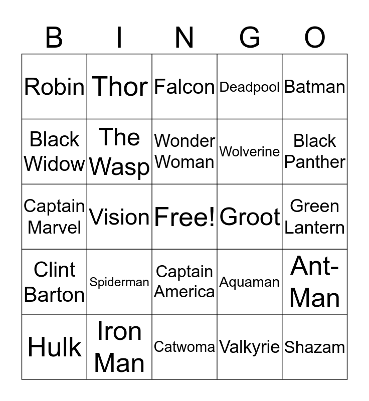 This bingo card has a free space and 24 words: Spiderman, Iron Man, Wonder Woman, Hulk, Batman, Robin, Black Widow, Thor, Groot, Captain America, Wolverine, Captain Marvel, Aquaman, Ant-Man, The Wasp, Valkyrie, Green Lantern, Falcon, Black Panther, Vision, Shazam, Clint Barton, Deadpool and Catwoma.