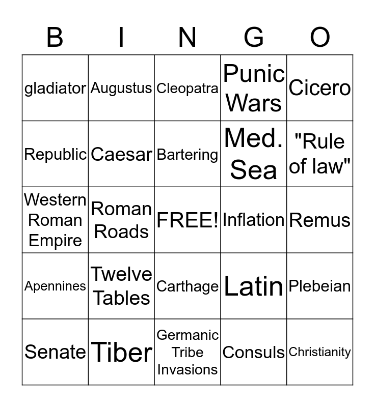 This bingo card has a free space and 24 words: Twelve Tables, Tiber, Bartering, Senate, Cicero, gladiator, Republic, Augustus, Inflation, Carthage, Med. Sea, Western Roman Empire, Latin, Plebeian, Caesar, Consuls, Remus, Cleopatra, "Rule of law", Roman Roads, Christianity, Apennines, Punic Wars and Germanic Tribe Invasions.