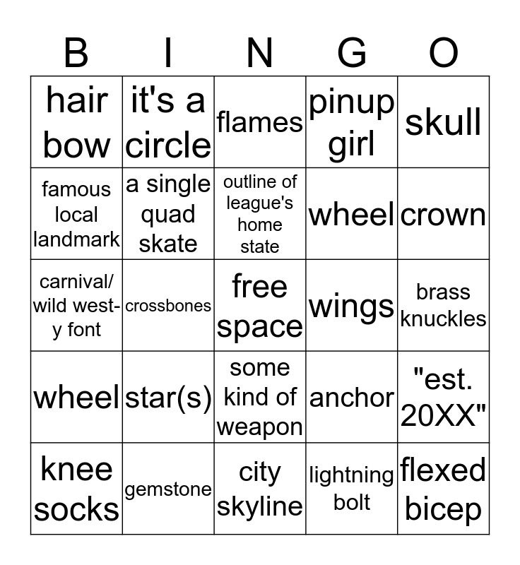 This bingo card has a free space and 24 words: star(s), gemstone, outline of league's home state, knee socks, skull, hair bow, famous local landmark, it's a circle, wings, some kind of weapon, wheel, carnival/ wild west-y font, anchor, "est. 20XX", a single quad skate, lightning bolt, brass knuckles, flames, crown, crossbones, flexed bicep, wheel, pinup girl and city skyline.