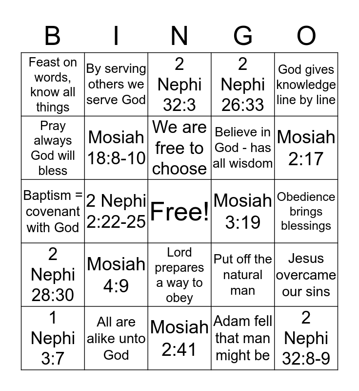 This bingo card has a free space and 26 words: Lord prepares a way to obey, Adam fell that man might be, We are free to choose, All are alike unto God, God gives knowledge line by line, Feast on words, know all things, Pray always God will bless, By serving others we serve God, Obedience brings blessings, Put off the natural man, Believe in God - has all wisdom, Baptism = covenant with God, Jesus overcame our sins, 1 Nephi 3:7, 2 Nephi 2:22-25, 2 Nephi 2:27, 2 Nephi 26:33, 2 Nephi 28:30, 2 Nephi 32:3, 2 Nephi 32:8-9, Mosiah 2:17, Mosiah 2:41, Mosiah 3:19, Mosiah 4:9, Mosiah 18:8-10 and Alma 7:11-13.