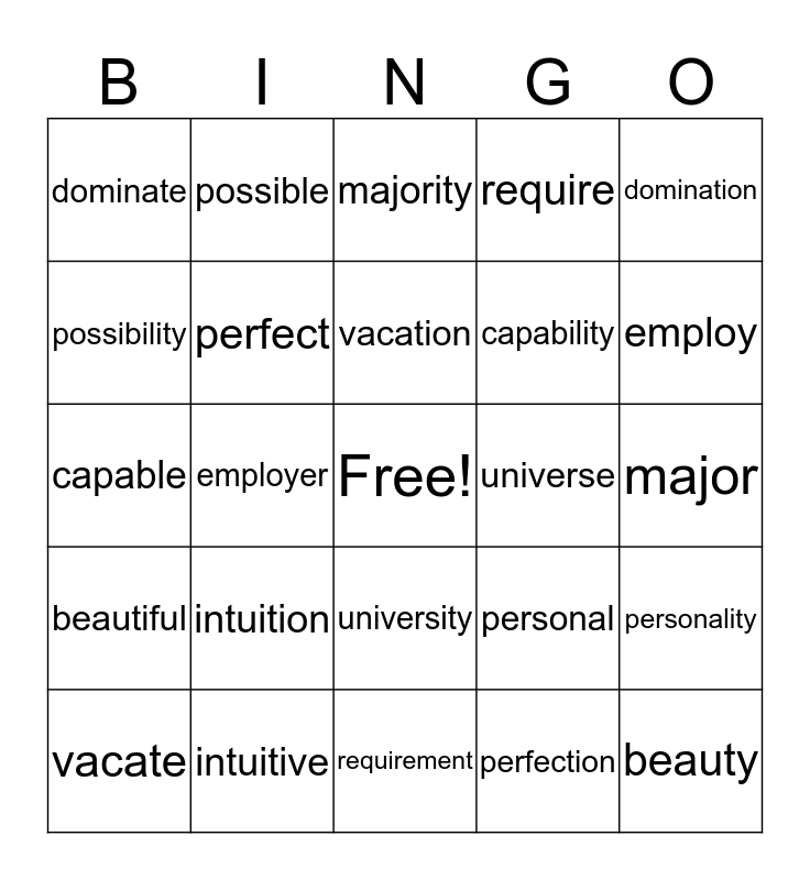 This bingo card has a free space and 24 words: intuition, intuitive, vacation, vacate, domination, dominate, possibility, possible, universe, university, capability, capable, personal, personality, perfect, perfection, major, majority, employ, employer, beauty, beautiful, require and requirement.