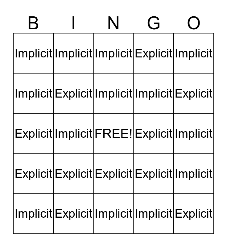 This bingo card has a free space and 24 words: Explicit, Explicit, Implicit, Implicit, Implicit, Implicit, Implicit, Implicit, Explicit, Explicit, Implicit, Explicit, Explicit, Implicit, Explicit, Implicit, Implicit, Implicit, Explicit, Implicit, Explicit, Explicit, Explicit and Implicit.