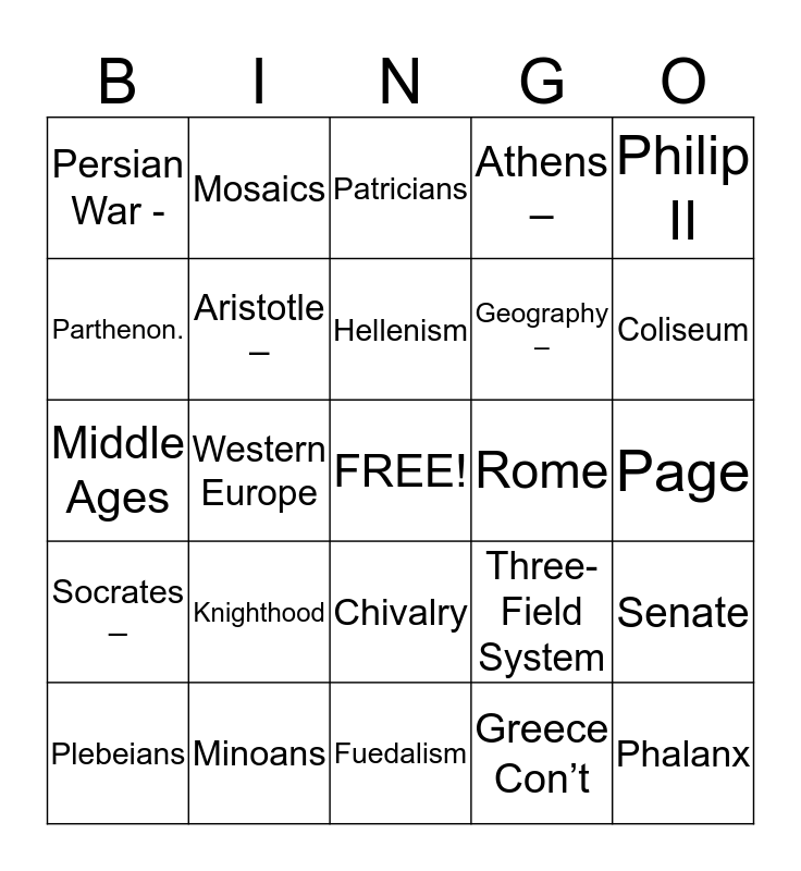 This bingo card has a free space and 59 words: Greece, Minoans, Myceneans, Socrates –, Greece Con’t, Plato –, Aristotle –, Pericles, Geography –, City-States –, Athens –, Sparta –, Parthenon., Acropolis, Peloponnesian War –, Persian War -, Phalanx, Philip II, Alexander the Great, Hellenism, Rome, Patricians, Plebeians, Senate, Pax Romana, Julius Caesar, Aqueducts, Arch, Coliseum, Diocletian, Constantine, Justinian I, Byzantine Empire, Justinian’s Code, Mosaics, Icon, The Great Schism, Western Europe, Eastern Orthodox (or Byzantine) Empire, ., Middle Ages, Social class, Knighthood, Page, Squire, Guilds, Apprentice, Journeyman, Master Craftsman, Chivalry, Fuedalism, Manor, Tithe, War of the Roses, Magna Carta-, Pope-, Three-Field System, Parliament, Crusades and Black Death.