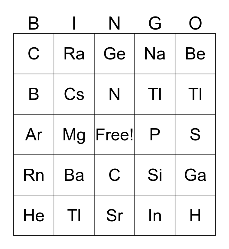 This bingo card has a free space and 50 words: Li, H, K, Sr, Ba, Ca, Ra, Al, B, Rb, Cs, Na, Ga, Si, Sn, Pb, N, P, Fr, Be, Mg, In, C, Tl, Ga, C, Tl, Ga, Ge, C, Br, Te, Po, F, Tl, O, As, Sb, Bi, S, Se, Ne, Cl, At, He, Ar, I, Kr, Rn and Xe.