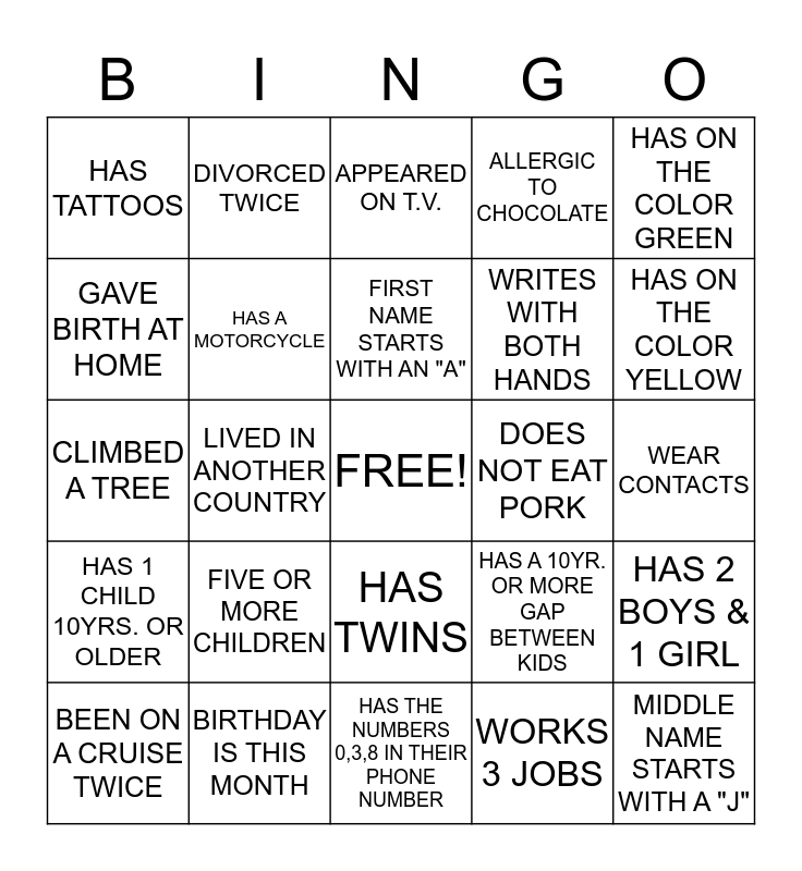 This bingo card has a free space and 24 words: FIVE OR MORE CHILDREN, BIRTHDAY IS THIS MONTH, FIRST NAME STARTS WITH AN "A", BEEN ON A CRUISE TWICE, HAS ON THE COLOR GREEN, HAS TATTOOS, GAVE BIRTH AT HOME, DIVORCED TWICE, DOES NOT EAT PORK, HAS TWINS, WRITES WITH BOTH HANDS, CLIMBED A TREE, HAS A 10YR. OR MORE GAP BETWEEN KIDS, HAS 2 BOYS & 1 GIRL, HAS A MOTORCYCLE, WORKS 3 JOBS, WEAR CONTACTS, APPEARED ON T.V., HAS ON THE COLOR YELLOW, LIVED IN ANOTHER COUNTRY, MIDDLE NAME STARTS WITH A "J", HAS 1 CHILD 10YRS. OR OLDER, ALLERGIC TO CHOCOLATE and HAS THE NUMBERS 0,3,8 IN THEIR PHONE NUMBER.