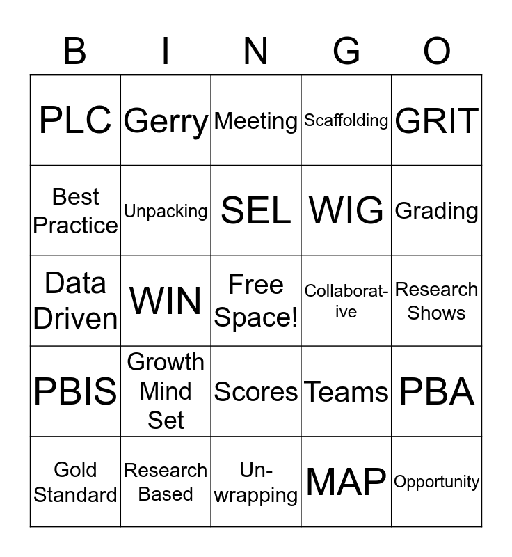 This bingo card has a free space and 24 words: Growth Mind Set, Research Based, SEL, Gold Standard, GRIT, PLC, Best Practice, Gerry, Collaborat- ive, Scores, WIG, Data Driven, Teams, PBA, Unpacking, MAP, Research Shows, Meeting, Grading, WIN, Opportunity, PBIS, Scaffolding and Un-wrapping.