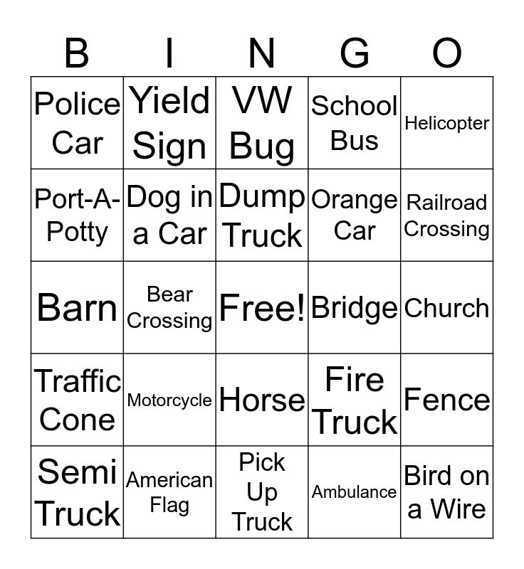This bingo card has a free space and 37 words: Tree, Bicycle, Stop Sign, Dog in a Car, Fence, Motorcycle, Dump Truck, Airplane, Helicopter, Deer Crossing, Bear Crossing, School Bus, Bird on a Wire, Church, Port-A-Potty, Traffic Cone, Cow, VW Bug, Horse, Bridge, Police Car, Railroad Crossing, Semi Truck, Pick Up Truck, Green Car, Ambulance, Yield Sign, Disney Related Billboard, Power Lines, Construction Worker, Speed Limit Sign, American Flag, Barn, Train, Fire Truck, Orange Car and Convertible.